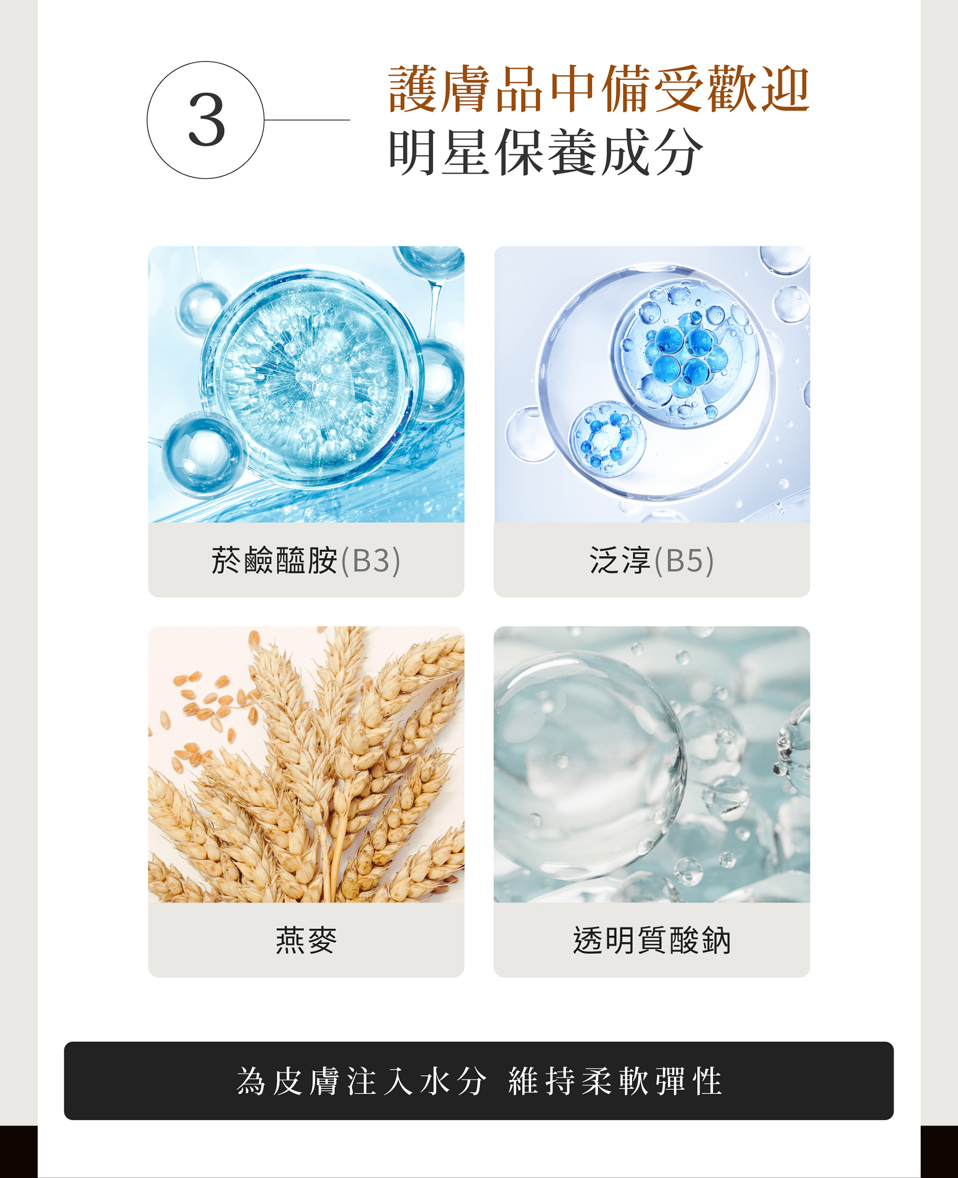 3.全方位明星保養成分|補水、舒緩、提升肌膚柔軟與彈性